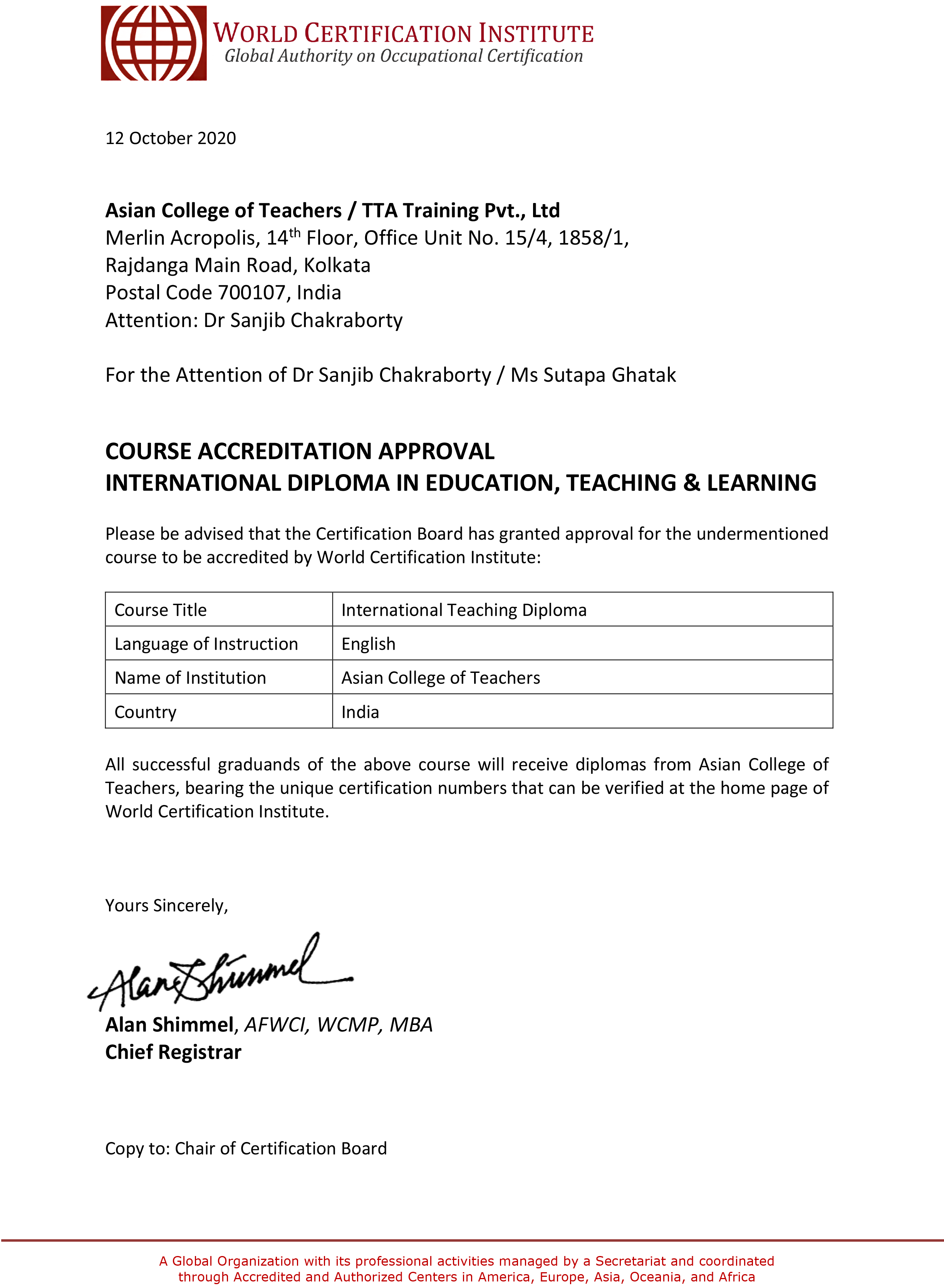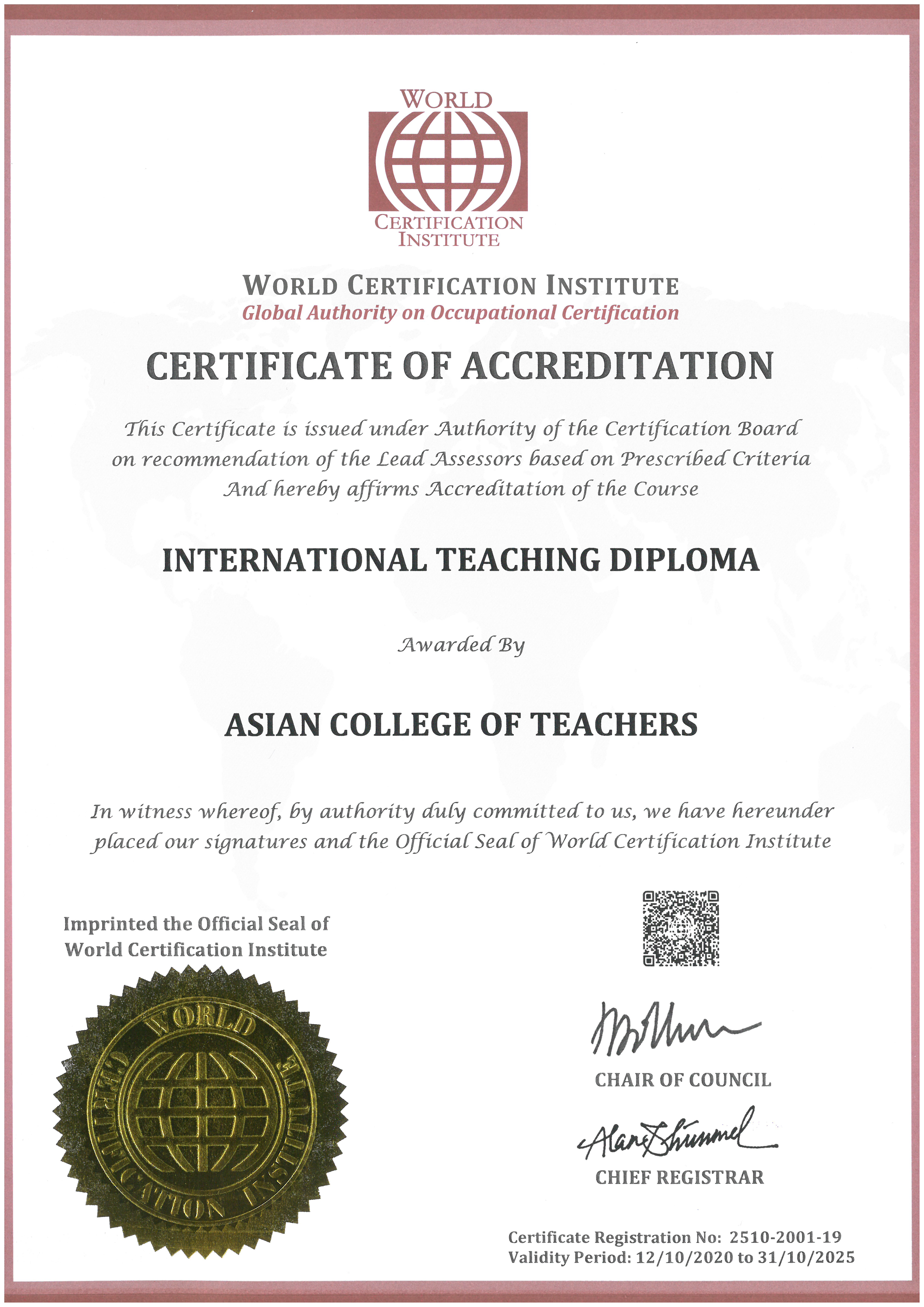 We at Asian College of Teachers (ACT) aspire to advance teaching and learning with a core purpose to make teacher education accessible to every corner of the globe. We strive to provide new knowledge and academic solutions to make a positive impact on teacher education and beyond. In a bid to impart quality training and build academic excellence, ACT collaborates with global accrediting bodies to meet the growing expectations of the students we educate. We are proud to share that World Certification Institute (WCI)has given accreditation to our International Teaching Diploma (ITD) course to provide the best in pre-primary training.