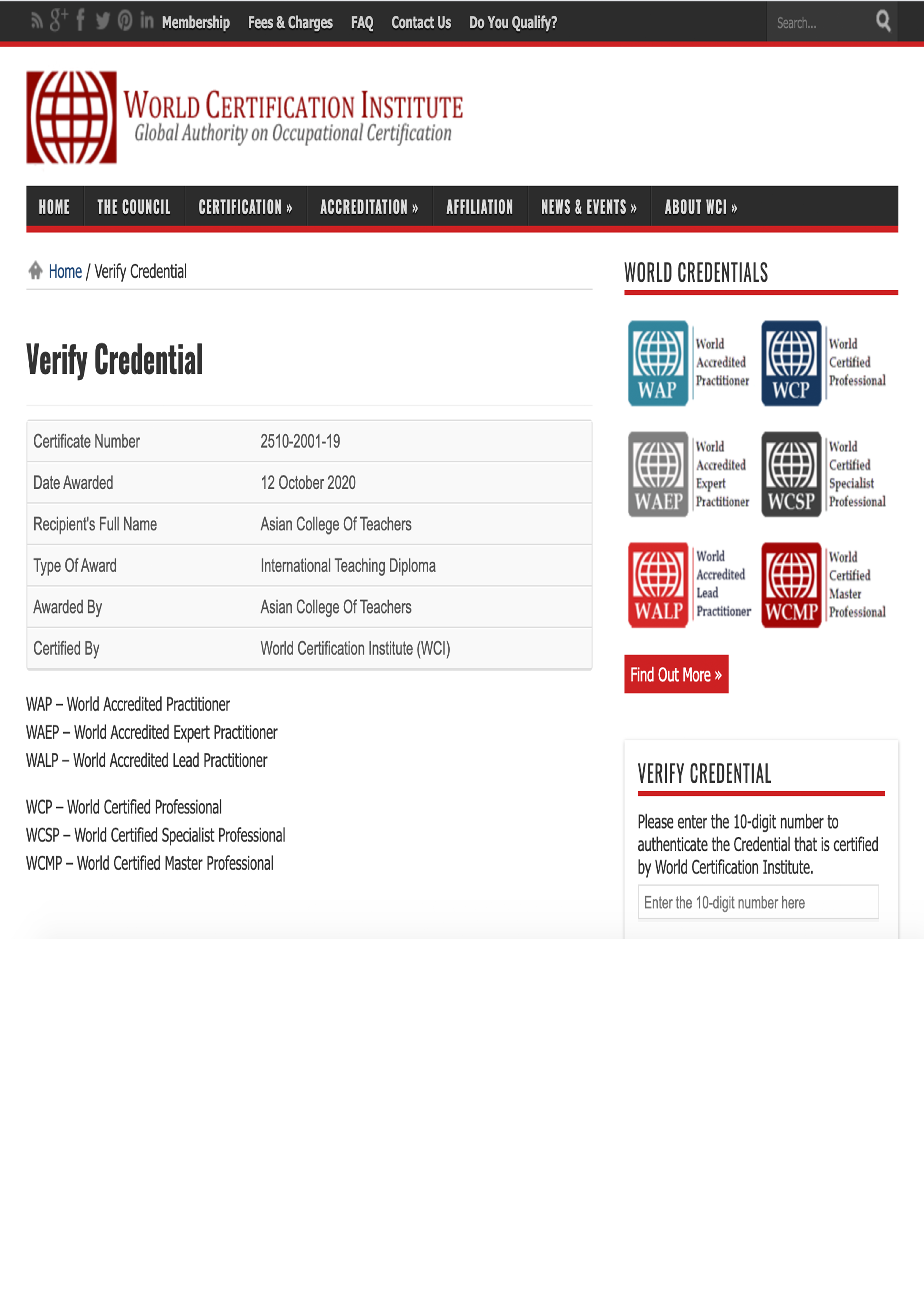 Students graduating from ACT’s ITD course can verify WCI’s Credential Award at WCI home page under “VERIFY CREDENTIAL” by keying in the 10 digits assigned to the Credential Award. https://www.worldcertification.org